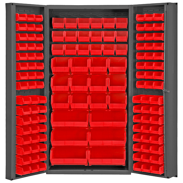 Bin Cabinet, Base Type Frame, Bin Color Red, Bin HxWxD (12) 8 in x 15 in x 7 in, (18) 6 in x 11 in x 5 in, (48) 4 in x 5 in x 3 in, (48) 4 in x 7 in x 3 in, (6) 16 in x 15 in x 7 in, Cabinet Color Gray, Cabinet Storage Components Bins, Door Type Deep Box, Frame Assembled Assembled, Mobility Stationary, Number of Bins 132, Number of Cabinet Bins 36, Number of Door Bins 96, Number of Shelves 0, Overall Depth 24 in, Overall Height 72 in, Overall Width 36 in, Bin Depth 5 in, 7 in, 11 in, 15 in