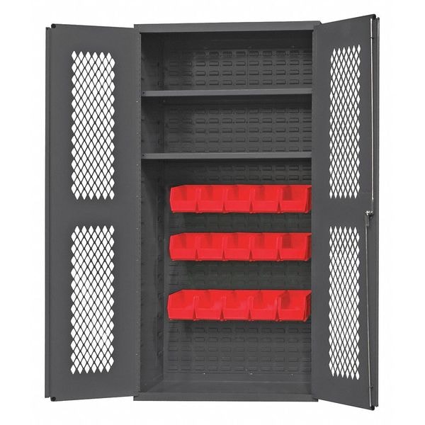 Bin Cabinet, Base Type Frame, Bin Color Red, Bin HxWxD (15) 6 in x 11 in x 5 in, Cabinet Color Gray, Cabinet Storage Components Bins, Shelves, Door Type Ventilated, Frame Assembled Assembled, Mobility Stationary, Number of Bins 15, Number of Cabinet Bins 15, Number of Door Bins 0, Number of Shelves 2, Overall Depth 24 in, Overall Height 72 in, Overall Width 36 in, Bin Depth 11 in, Bin Height 5 in, Bin Louvered Panel Location Cabinet Back, Bin Material Polypropylene, Bin Width 6 in