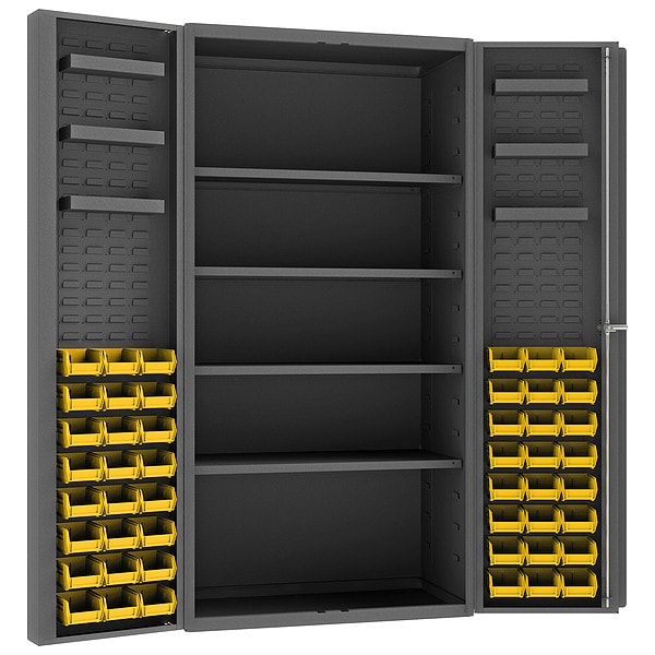 Bin Cabinet, Base Type Frame, Bin Color Yellow, Bin HxWxD (48) 4 in x 5 in x 3 in, Cabinet Color Gray, Cabinet Storage Components Bins, Shelves, Door Type Deep Box, Frame Assembled Assembled, Mobility Stationary, Number of Bins 48, Number of Cabinet Bins 0, Number of Door Bins 48, Number of Shelves 10, Overall Depth 24 in, Overall Height 72 in, Overall Width 36 in, Bin Depth 5 in, Bin Height 3 in, Bin Louvered Panel Location Door, Bin Material Polypropylene, Bin Width 4 in