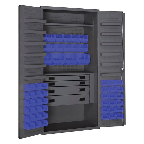 Bin Cabinet, Base Type Frame, Bin Color Blue, Bin HxWxD (12) 6 in x 11 in x 5 in, (36) 4 in x 5 in x 3 in, (4) 8 in x 15 in x 7 in, Cabinet Color Gray, Cabinet Storage Components Bins, Drawers, Shelves, Door Type Flush, Drawer Height 2 in, 4 in, 5 in, Drawer Width 28 7/8 in, Frame Assembled Assembled, Mobility Stationary, Number of Bins 52, Number of Cabinet Bins 16, Number of Door Bins 36, Number of Shelves 13, Overall Depth 24 in, Overall Height 72 in, Overall Width 36 in