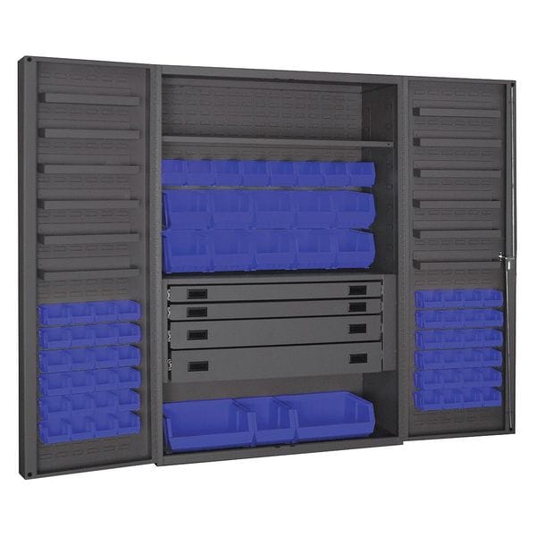 Bin Cabinet, Base Type Frame, Bin Color Blue, Bin HxWxD (11) 8 in x 15 in x 7 in, (2) 16 in x 15 in x 7 in, (48) 4 in x 5 in x 3 in, (8) 6 in x 11 in x 5 in, Cabinet Color Gray, Cabinet Storage Components Bins, Drawers, Shelves, Door Type Deep Box, Drawer Height 3 in, 5 in, 6 in, Drawer Width 40 7/8 in, Frame Assembled Assembled, Mobility Stationary, Number of Bins 69, Number of Cabinet Bins 21, Number of Door Bins 48, Number of Shelves 13, Overall Depth 24 in, Overall Height 72 in