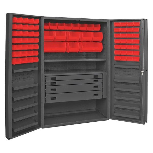 Bin Cabinet, Base Type Frame, Bin Color Red, Bin HxWxD (2) 16 in x 15 in x 7 in, (56) 4 in x 5 in x 3 in, (6) 8 in x 15 in x 7 in, (8) 6 in x 11 in x 5 in, Cabinet Color Gray, Cabinet Storage Components Bins, Drawers, Shelves, Door Type Deep Box, Drawer Height 3 in, 5 in, 6 in, Drawer Width 40 7/8 in, Frame Assembled Assembled, Mobility Stationary, Number of Bins 72, Number of Cabinet Bins 16, Number of Door Bins 56, Number of Shelves 13, Overall Depth 24 in, Overall Height 72 in