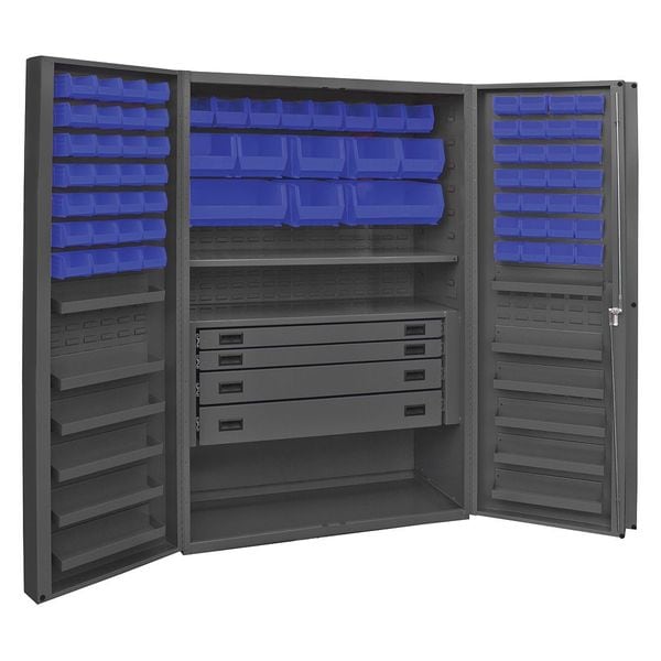 Bin Cabinet, Base Type Frame, Bin Color Blue, Bin HxWxD (2) 16 in x 15 in x 7 in, (56) 4 in x 5 in x 3 in, (6) 8 in x 15 in x 7 in, (8) 6 in x 11 in x 5 in, Cabinet Color Gray, Cabinet Storage Components Bins, Drawers, Shelves, Door Type Deep Box, Drawer Height 3 in, 5 in, 6 in, Drawer Width 40 7/8 in, Frame Assembled Assembled, Mobility Stationary, Number of Bins 72, Number of Cabinet Bins 16, Number of Door Bins 56, Number of Shelves 13, Overall Depth 24 in, Overall Height 72 in