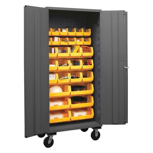 Bin Cabinet, Base Type Casters, Bin Color Yellow, Bin HxWxD (12) 6 in x 11 in x 5 in, (12) 8 in x 15 in x 7 in, (6) 16 in x 15 in x 7 in, Cabinet Color Gray, Cabinet Storage Components Bins, Door Type Solid, Frame Assembled Assembled, Mobility Mobile, Number of Bins 30, Number of Cabinet Bins 30, Number of Door Bins 0, Number of Shelves 0, Overall Depth 24 in, Overall Height 80 in, Overall Width 36 in, Bin Depth (12) 11 in, (12) 15 in, (6) 15 in, Bin Height (12) 5 in, (12) 7 in, (6) 7 in