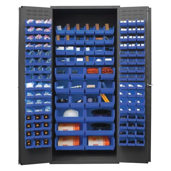 Bin Cabinet, Base Type Frame, Bin Color Blue, Bin HxWxD (12) 8 in x 15 in x 7 in, (24) 6 in x 11 in x 5 in, (48) 4 in x 5 in x 3 in, (48) 4 in x 7 in x 3 in, (6) 16 in x 15 in x 7 in, Cabinet Color Gray, Cabinet Storage Components Bins, Door Type Flush, Frame Assembled Assembled, Mobility Stationary, Number of Bins 138, Number of Cabinet Bins 42, Number of Door Bins 96, Number of Shelves 0, Overall Depth 24 in, Overall Height 84 in, Overall Width 36 in, Bin Depth 5 in, 7 in, 11 in, 15 in