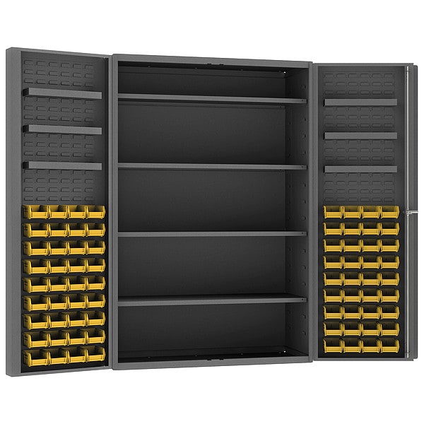 Bin Cabinet, Base Type Frame, Bin Color Yellow, Bin HxWxD (72) 4 in x 5 in x 3 in, Cabinet Color Gray, Cabinet Storage Components Bins, Shelves, Door Type Deep Box, Frame Assembled Assembled, Mobility Stationary, Number of Bins 72, Number of Cabinet Bins 0, Number of Door Bins 72, Number of Shelves 10, Overall Depth 24 in, Overall Height 72 in, Overall Width 48 in, Bin Depth 5 in, Bin Height 3 in, Bin Louvered Panel Location Door, Bin Material Polypropylene, Bin Width 4 in
