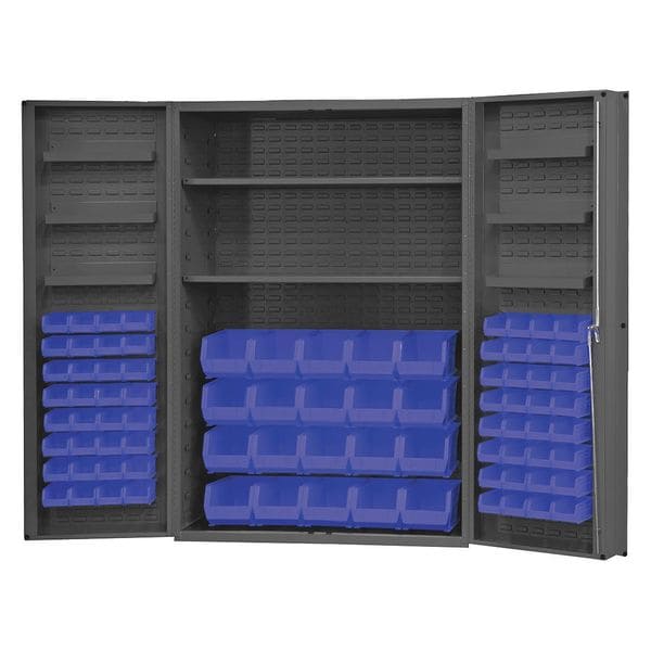 Bin Cabinet, Base Type Frame, Bin Color Blue, Bin HxWxD (20) 8 in x 15 in x 7 in, (64) 4 in x 7 in x 3 in, Cabinet Color Gray, Cabinet Storage Components Bins, Shelves, Door Type Deep Box, Frame Assembled Assembled, Mobility Stationary, Number of Bins 84, Number of Cabinet Bins 20, Number of Door Bins 64, Number of Shelves 8, Overall Depth 24 in, Overall Height 72 in, Overall Width 48 in, Bin Depth 7 in, 15 in, Bin Height 3 in, 7 in, Bin Louvered Panel Location Door, Bin Material Polypropylene