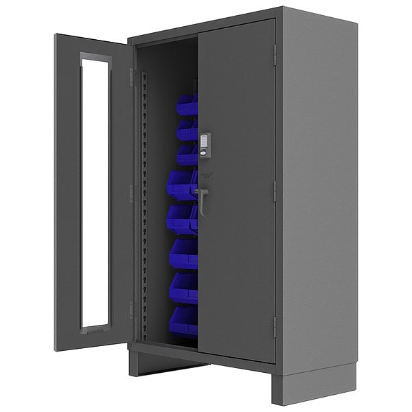 Bin Cabinet, Base Type Legs, Bin Color Blue, Bin HxWxD (12) 8 in x 15 in x 7 in, (24) 6 in x 11 in x 5 in, (6) 16 in x 15 in x 7 in, Cabinet Color Gray, Cabinet Storage Components Bins, Door Type Clearview, Solid, Frame Assembled Assembled, Mobility Stationary, Number of Bins 42, Number of Cabinet Bins 42, Number of Door Bins 0, Number of Shelves 0, Overall Depth 24 in, Overall Height 78 in, Overall Width 48 in, Bin Depth 11 in, 15 in, Bin Height 5 in, 7 in