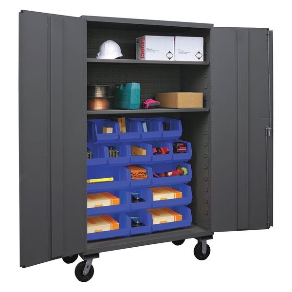 Bin Cabinet, Base Type Casters, Bin Color Blue, Bin HxWxD (12) 8 in x 15 in x 7 in, (6) 16 in x 15 in x 7 in, Cabinet Color Gray, Cabinet Storage Components Bins, Shelves, Door Type Solid, Frame Assembled Assembled, Mobility Mobile, Number of Bins 18, Number of Cabinet Bins 18, Number of Door Bins 0, Number of Shelves 2, Overall Depth 24 in, Overall Height 80 in, Overall Width 48 in, Bin Depth (12) 15 in, (6) 15 in, Bin Height (12) 7 in, (6) 7 in, Bin Material Polypropylene