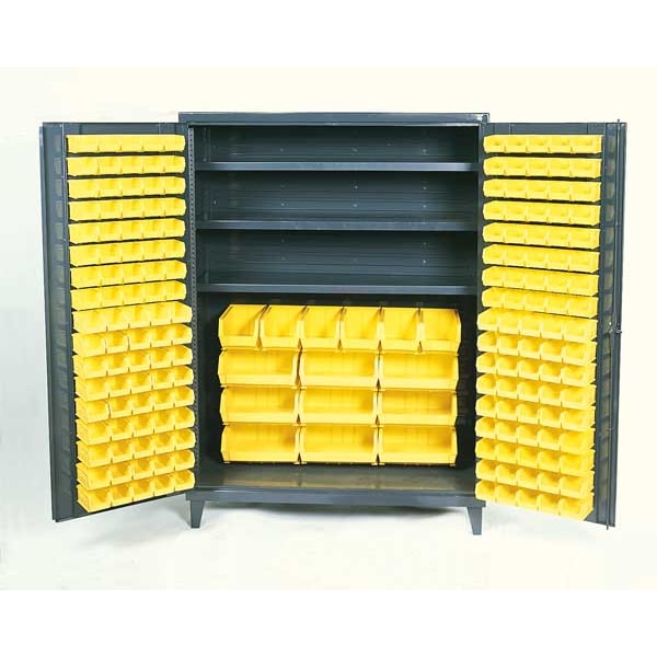 Bin Cabinet, Base Type Legs, Bin Color Yellow, Bin HxWxD (6) 8 in x 15 in x 7 in, (80) 4 in x 5 in x 3 in, (9) 16 in x 15 in x 7 in, (90) 4 in x 7 in x 3 in, Cabinet Color Gray, Cabinet Storage Components Bins, Shelves, Door Type Flush, Frame Assembled Assembled, Mobility Stationary, Number of Bins 185, Number of Cabinet Bins 15, Number of Door Bins 170, Number of Shelves 3, Overall Depth 24 in, Overall Height 84 in, Overall Width 60 in, Bin Depth 5 in, 7 in, 15 in, Bin Height 3 in, 7 in