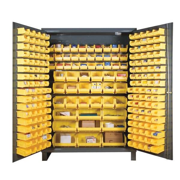 Bin Cabinet, Base Type Legs, Bin Color Yellow, Bin HxWxD (18) 8 in x 15 in x 7 in, (30) 6 in x 11 in x 5 in, (80) 4 in x 5 in x 3 in, (9) 16 in x 15 in x 7 in, (90) 4 in x 7 in x 3 in, Cabinet Color Gray, Cabinet Storage Components Bins, Door Type Flush, Frame Assembled Assembled, Mobility Stationary, Number of Bins 227, Number of Cabinet Bins 57, Number of Door Bins 170, Number of Shelves 0, Overall Depth 24 in, Overall Height 84 in, Overall Width 60 in, Bin Depth 5 in, 7 in, 11 in, 15 in
