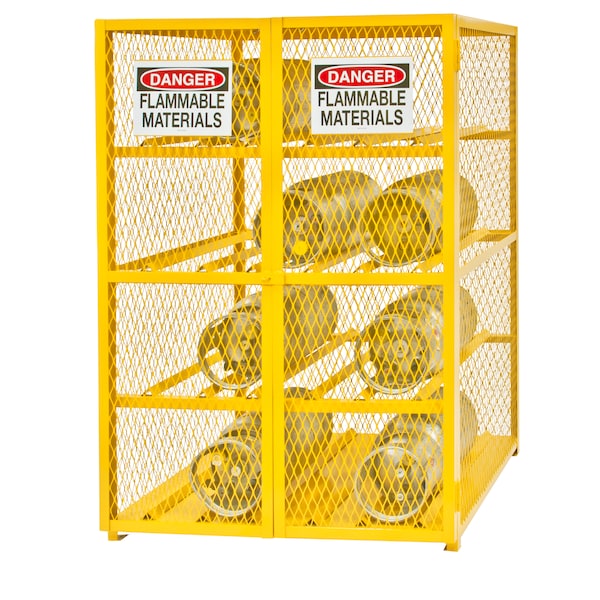 Gas Cylinder Cabinet, Color Yellow, Construction Expanded Metal, Angle Iron, Fully Welded, Finish Powder Coated, Includes Padlock Hasp, Chain