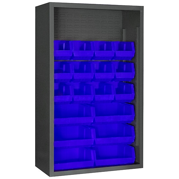 Bin Cabinet, Bin Style Hook-On-Bins, Bin Material Polypropylene, (12) 7 in x 8 in x 15 in (6) 7 in x 16 in x 15 in Bin HxWxD, Bin Height 7 in, Bin Depth 15 in, Bin Color Blue, Frame Material Steel, Frame Color Gray, Powder Coated, Includes Bins Yes, Bin Width 8 in, 16 in, Includes Mounting Hardware No, Load Capacity per Shelf Not Applicable, Mobility Stationary, Number of Bins 18, Number of Shelves Not Applicable, Number of Usable Sides 1, Overall Depth 18 in, Overall Height 60 in