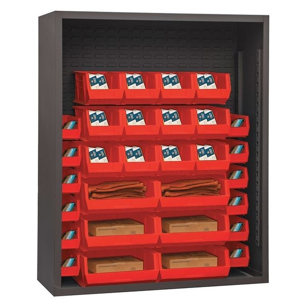Bin Cabinet, Bin Style Hook-On-Bins, Bin Material Polypropylene, (12) 5 in x 6 in x 11 in (12) 7 in x 8 in x 15 in (6) 7 in x 16 in x 15 in Bin HxWxD, Bin Height 7 in, Bin Depth 11 in, 15 in, Bin Color Red, Frame Material Steel, Frame Color Gray, Powder Coated, Includes Bins Yes, Bin Width 6 in, 8 in, 16 in, Includes Mounting Hardware No, Load Capacity per Shelf Not Applicable, Mobility Stationary, Number of Bins 30, Number of Shelves Not Applicable, Number of Usable Sides 1, Overall Depth 18 in