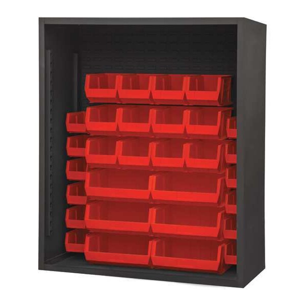 Bin Cabinet, Bin Style Hook-On-Bins, Bin Material Polypropylene, (12) 5 in x 6 in x 11 in (12) 7 in x 8 in x 15 in (6) 7 in x 16 in x 15 in Bin HxWxD, Bin Height 7 in, Bin Depth 11 in, 15 in, Bin Color Red, Frame Material Steel, Frame Color Gray, Powder Coated, Includes Bins Yes, Bin Width 6 in, 8 in, 16 in, Includes Mounting Hardware No, Load Capacity per Shelf Not Applicable, Mobility Stationary, Number of Bins 30, Number of Shelves Not Applicable, Number of Usable Sides 1, Overall Depth 24 in