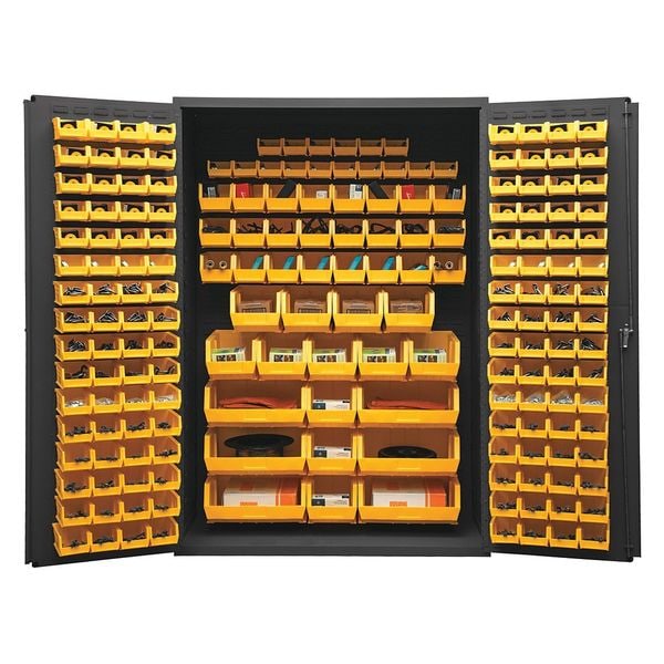 Bin Cabinet, Base Type Frame, Bin Color Yellow, Bin HxWxD (12) 8 in x 15 in x 7 in, (24) 6 in x 11 in x 5 in, (48) 4 in x 5 in x 3 in, (6) 16 in x 15 in x 7 in, (96) 4 in x 7 in x 3 in, Cabinet Color Gray, Cabinet Storage Components Bins, Door Type Flush, Frame Assembled Assembled, Mobility Stationary, Number of Bins 186, Number of Cabinet Bins 58, Number of Door Bins 128, Number of Shelves 0, Overall Depth 24 in, Overall Height 72 in, Overall Width 48 in, Bin Depth 5 in, 7 in, 11 in, 15 in