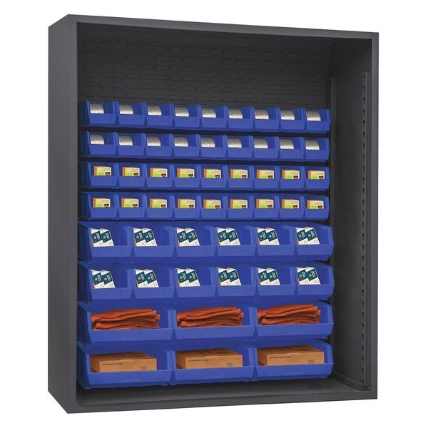 Bin Cabinet, Bin Style Hook-On-Bins, Bin Material Polypropylene, (36) 5 in x 6 in x 11 in (12) 7 in x 8 in x 15 in (6) 7 in x 16 in x 15 in Bin HxWxD, Bin Height 7 in, Bin Depth 11 in, 15 in, Bin Color Blue, Frame Material Steel, Frame Color Gray, Powder Coated, Includes Bins Yes, Bin Width 6 in, 8 in, 16 in, Includes Mounting Hardware No, Load Capacity per Shelf Not Applicable, Mobility Stationary, Number of Bins 54, Number of Shelves Not Applicable, Number of Usable Sides 1