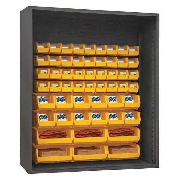 Bin Cabinet, Bin Style Hook-On-Bins, Bin Material Polypropylene, (36) 5 in x 6 in x 11 in (12) 7 in x 8 in x 15 in (6) 7 in x 16 in x 15 in Bin HxWxD, Bin Height 7 in, Bin Depth 11 in, 15 in, Bin Color Yellow, Frame Material Steel, Frame Color Gray, Powder Coated, Includes Bins Yes, Bin Width 6 in, 8 in, 16 in, Includes Mounting Hardware No, Load Capacity per Shelf Not Applicable, Mobility Stationary, Number of Bins 54, Number of Shelves Not Applicable, Number of Usable Sides 1