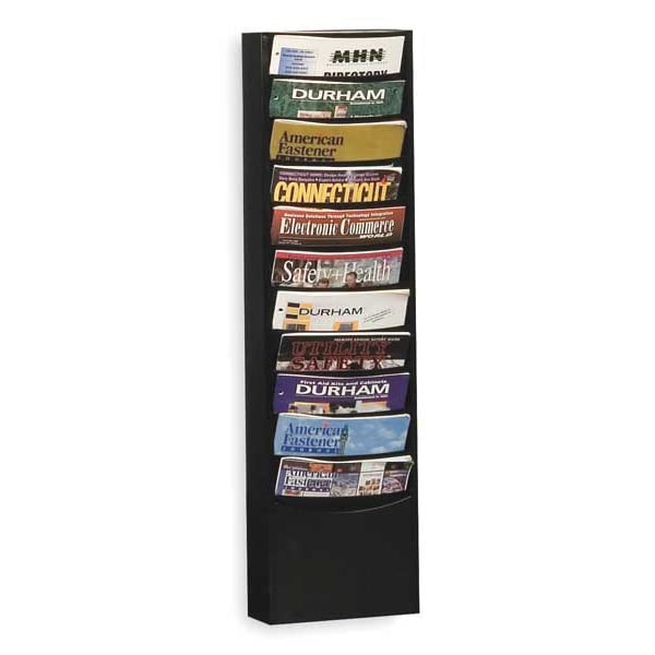 Literature Rack, Product Type Literature Rack, Number of Compartments 11, Includes Label Holders No, Overall Height 36 in, Overall Depth 4 1/8 in, Overall Width 9 3/4 in, Material Steel, Color Black, Literature Form Factor Letter, Compatible Manufacturer Part Number Not Applicable, Swivel No, Assembly Assembled, Compatible Grainger Part Number Not Applicable, Compartment Type Pocket, Mountable Yes, Mounting Location Wall