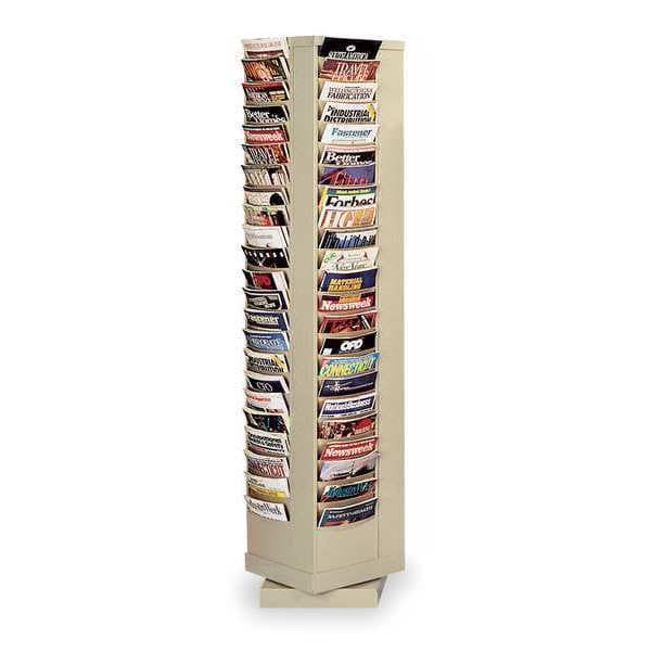 Rotating Literature Rack, Product Type Rotating Literature Rack, Number of Compartments 92, Includes Label Holders No, Overall Height 68 3/8 in, Overall Depth 14 1/8 in, Overall Width 14 1/8 in, Material Steel, Color Tan, Literature Form Factor Letter, Compatible Manufacturer Part Number Not Applicable, Swivel Yes, Assembly Unassembled, Compatible Grainger Part Number Not Applicable, Weight Capacity 150 lb, Compartment Type Pocket