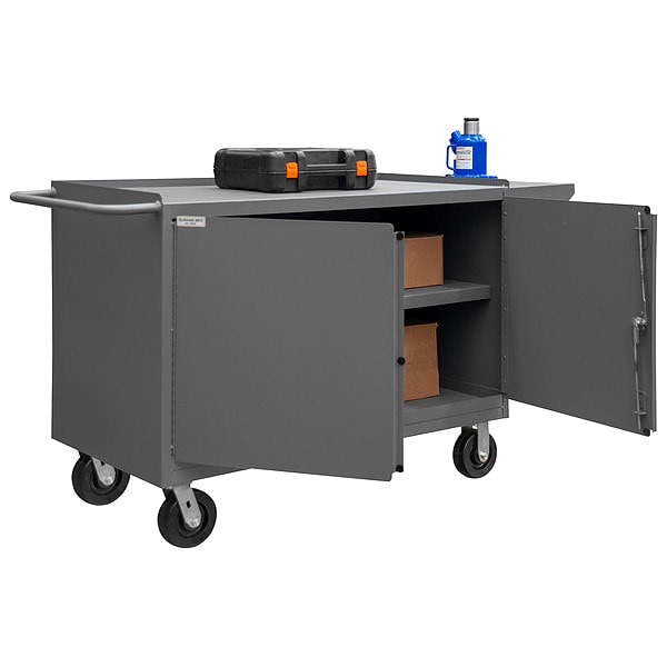 Mobile Cabinet Workbench, Top Material Steel, Color Gray, Non-Metal Top Thickness Not Applicable, Number of Doors 2, Number of Drawers 0, Number of Shelves 1, Overall Depth 24 in, Overall Height 37 3/4 in, Overall Load Capacity 2,000 lb, Overall Width 66 in, Top Metal Material Gauge 14 ga, Included Components Back Stop, Handle on Side, Lower Shelf, Side Stops, Vice Support Shelf, Assembly Fully Assembled, Cabinet Interior Depth 24 in, Caster Mount Type Plate, Caster Type (2) Rigid, (2) Swivel