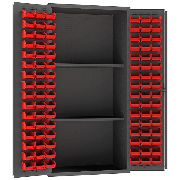 Pegboard Bin Cabinet, Base Type Frame, Bin Color Red, Bin HxWxD (96) 4 in x 5 in x 3 in, Cabinet Color Gray, Cabinet Storage Components Bins, Pegboard, Shelves, Door Type Flush, Frame Assembled Assembled, Mobility Stationary, Number of Bins 96, Number of Cabinet Bins 96, Number of Door Bins 96, Number of Shelves 2, Overall Depth 24 in, Overall Height 72 in, Overall Width 36 in, Bin Depth 5 in, Bin Height 3 in, Bin Material Polypropylene, Bin Width 4 in, Method of Construction Welded