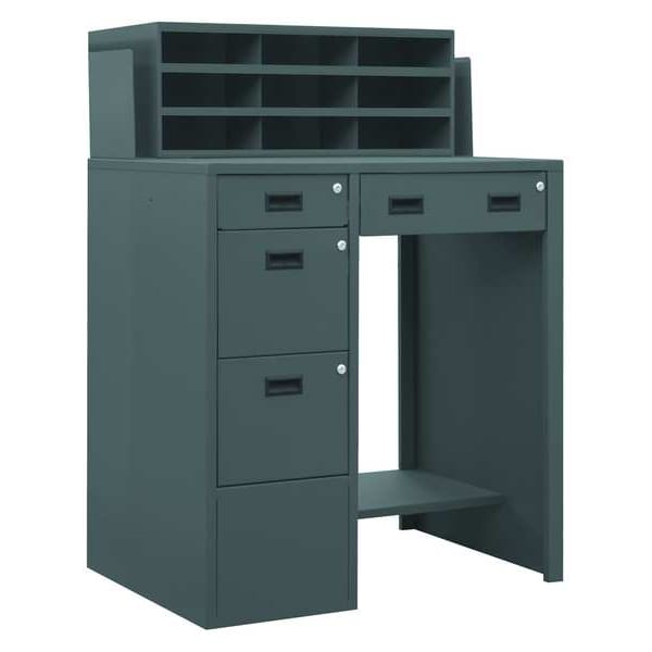 Shop Desk, Number of Doors 0, Number of Shelves 1, Desk Color Gray, Desk Style Pedestal/Panel, Includes Keyboard Tray No, Mobility Stationary, Number of Compartments 14, Number of Drawers 4, Overall Depth 29 in, Overall Height 55 5/8 in, Overall Width 39 in, Shelf Depth 29 in, Shelf Width 39 in, Writing Surface Height from Ground 42 in, Writing Surface Slope 0 Degrees , Caster Type Not Applicable, Caster Wheel Diameter Not Applicable, Desk Finish Powder Coated, Desk Material Steel