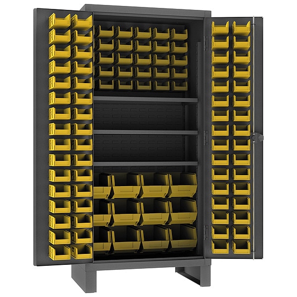Bin Cabinet, Base Type Legs, Bin Color Yellow, Bin HxWxD (12) 8 in x 15 in x 7 in, (96) 4 in x 7 in x 3 in, Cabinet Color Gray, Cabinet Storage Components Bins, Shelves, Door Type Flush, Frame Assembled Assembled, Mobility Stationary, Number of Bins 108, Number of Cabinet Bins 12, Number of Door Bins 96, Number of Shelves 3, Overall Depth 24 in, Overall Height 78 in, Overall Width 36 in, Bin Depth 7 in, 15 in, Bin Height 3 in, 7 in, Bin Material Polypropylene, Bin Width 4 in, 8 in