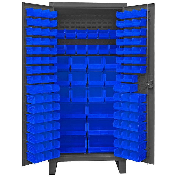Bin Cabinet, Base Type Legs, Bin Color Blue, Bin HxWxD (12) 6 in x 11 in x 5 in, (12) 8 in x 15 in x 7 in, (48) 4 in x 5 in x 3 in, (48) 4 in x 7 in x 3 in, (6) 16 in x 15 in x 7 in, Cabinet Color Gray, Cabinet Storage Components Bins, Door Type Flush, Frame Assembled Assembled, Mobility Stationary, Number of Bins 126, Number of Cabinet Bins 30, Number of Door Bins 96, Number of Shelves 0, Overall Depth 24 in, Overall Height 78 in, Overall Width 36 in, Bin Depth 5 in, 7 in, 11 in, 15 in