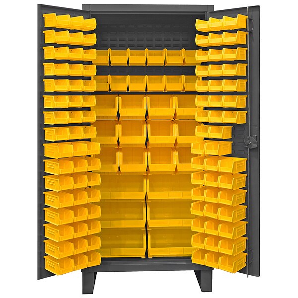 Bin Cabinet, Base Type Legs, Bin Color Yellow, Bin HxWxD (12) 6 in x 11 in x 5 in, (12) 8 in x 15 in x 7 in, (48) 4 in x 5 in x 3 in, (48) 4 in x 7 in x 3 in, (6) 16 in x 15 in x 7 in, Cabinet Color Gray, Cabinet Storage Components Bins, Door Type Flush, Frame Assembled Assembled, Mobility Stationary, Number of Bins 126, Number of Cabinet Bins 30, Number of Door Bins 96, Number of Shelves 0, Overall Depth 24 in, Overall Height 78 in, Overall Width 36 in, Bin Depth 5 in, 7 in, 11 in, 15 in