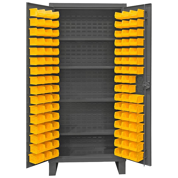 Bin Cabinet, Base Type Legs, Bin Color Yellow, Bin HxWxD (96) 4 in x 5 in x 3 in, Cabinet Color Gray, Cabinet Storage Components Bins, Shelves, Door Type Flush, Frame Assembled Assembled, Mobility Stationary, Number of Bins 96, Number of Cabinet Bins 0, Number of Door Bins 96, Number of Shelves 4, Overall Depth 24 in, Overall Height 78 in, Overall Width 36 in, Bin Depth 5 in, Bin Height 3 in, Bin Material Polypropylene, Bin Width 4 in, Shelf Adjustability (4) Adjustable, Shelf Depth 15 7/8 in