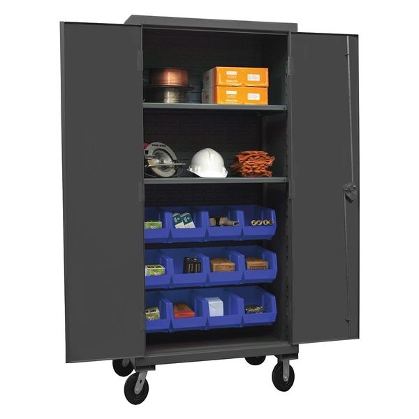 Bin Cabinet, Base Type Casters, Bin Color Blue, Bin HxWxD (12) 8 in x 15 in x 7 in, Cabinet Color Gray, Cabinet Storage Components Bins, Shelves, Door Type Solid, Frame Assembled Assembled, Mobility Mobile, Number of Bins 12, Number of Cabinet Bins 12, Number of Door Bins 0, Number of Shelves 2, Overall Depth 24 in, Overall Height 80 in, Overall Width 36 in, Bin Depth 15 in, Bin Height 7 in, Bin Material Polypropylene, Bin Width 8 in, Shelf Adjustability (2) Adjustable