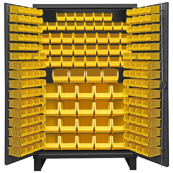 Bin Cabinet, Base Type Legs, Bin Color Yellow, Bin HxWxD (24) 6 in x 11 in x 5 in, (24) 8 in x 15 in x 7 in, (60) 4 in x 5 in x 3 in, (84) 4 in x 7 in x 3 in, Cabinet Color Gray, Cabinet Storage Components Bins, Door Type Flush, Frame Assembled Assembled, Mobility Stationary, Number of Bins 192, Number of Cabinet Bins 64, Number of Door Bins 128, Number of Shelves 0, Overall Depth 24 in, Overall Height 78 in, Overall Width 48 in, Bin Depth 5 in, 7 in, 11 in, 15 in, Bin Height 3 in, 5 in, 7 in