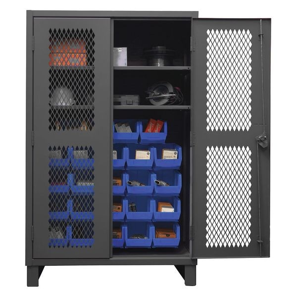 Bin Cabinet, Base Type Legs, Bin Color Blue, Bin HxWxD (24) 8 in x 15 in x 7 in, Cabinet Color Gray, Cabinet Storage Components Bins, Shelves, Door Type Ventilated, Frame Assembled Assembled, Mobility Stationary, Number of Bins 24, Number of Cabinet Bins 24, Number of Door Bins 0, Number of Shelves 2, Overall Depth 24 in, Overall Height 78 in, Overall Width 48 in, Bin Depth 15 in, Bin Height 7 in, Bin Material Polypropylene, Bin Width 8 in, Shelf Adjustability (2) Adjustable