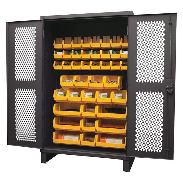Bin Cabinet, Base Type Legs, Bin Color Yellow, Bin HxWxD (12) 8 in x 15 in x 7 in, (24) 6 in x 11 in x 5 in, (6) 16 in x 15 in x 7 in, Cabinet Color Gray, Cabinet Storage Components Bins, Door Type Ventilated, Frame Assembled Assembled, Mobility Stationary, Number of Bins 42, Number of Cabinet Bins 42, Number of Door Bins 0, Number of Shelves 0, Overall Depth 24 in, Overall Height 78 in, Overall Width 48 in, Bin Depth 11 in, 15 in, Bin Height 5 in, 7 in, Bin Louvered Panel Location Door