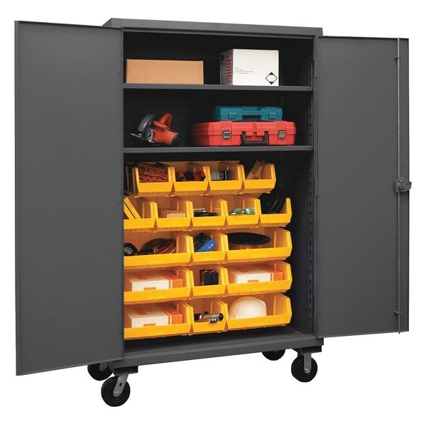 Bin Cabinet, Base Type Casters, Bin Color Yellow, Bin HxWxD (12) 8 in x 15 in x 7 in, (6) 16 in x 15 in x 7 in, Cabinet Color Gray, Cabinet Storage Components Bins, Door Type Solid, Frame Assembled Assembled, Mobility Mobile, Number of Bins 18, Number of Cabinet Bins 18, Number of Door Bins 0, Number of Shelves 2, Overall Depth 24 in, Overall Height 80 in, Overall Width 48 in, Bin Depth (12) 15 in, (6) 15 in, Bin Height (12) 7 in, (6) 7 in, Bin Material Polypropylene