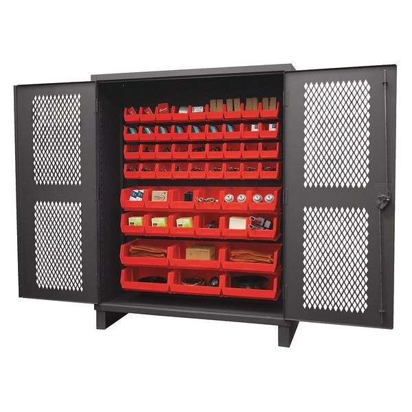 Bin Cabinet, Base Type Legs, Bin Color Red, Bin HxWxD (12) 8 in x 15 in x 7 in, (36) 6 in x 11 in x 5 in, (6) 16 in x 15 in x 7 in, Cabinet Color Gray, Cabinet Storage Components Bins, Door Type Ventilated, Frame Assembled Assembled, Mobility Stationary, Number of Bins 54, Number of Cabinet Bins 54, Number of Door Bins 0, Number of Shelves 0, Overall Depth 24 in, Overall Height 78 in, Overall Width 60 in, Bin Depth 11 in, 15 in, Bin Height 5 in, 7 in, Bin Louvered Panel Location Door