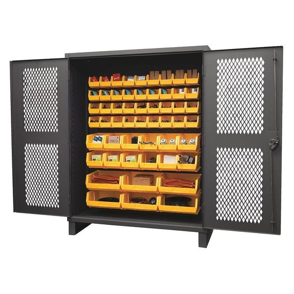 Bin Cabinet, Base Type Legs, Bin Color Yellow, Bin HxWxD (12) 8 in x 15 in x 7 in, (36) 6 in x 11 in x 5 in, (6) 16 in x 15 in x 7 in, Cabinet Color Gray, Cabinet Storage Components Bins, Door Type Ventilated, Frame Assembled Assembled, Mobility Stationary, Number of Bins 54, Number of Cabinet Bins 54, Number of Door Bins 0, Number of Shelves 0, Overall Depth 24 in, Overall Height 78 in, Overall Width 60 in, Bin Depth 11 in, 15 in, Bin Height 5 in, 7 in, Bin Louvered Panel Location Door