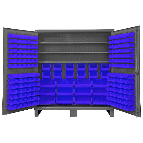 Bin Cabinet, Base Type Legs, Bin Color Blue, Bin HxWxD (12) 16 in x 15 in x 7 in, (12) 8 in x 15 in x 7 in, (84) 4 in x 5 in x 3 in, (84) 4 in x 7 in x 3 in, Cabinet Color Gray, Cabinet Storage Components Bins, Shelves, Door Type Flush, Frame Assembled Assembled, Mobility Stationary, Number of Bins 192, Number of Cabinet Bins 24, Number of Door Bins 168, Number of Shelves 3, Overall Depth 24 in, Overall Height 78 in, Overall Width 72 in, Bin Depth 5 in, 7 in, 15 in, Bin Height 3 in, 7 in