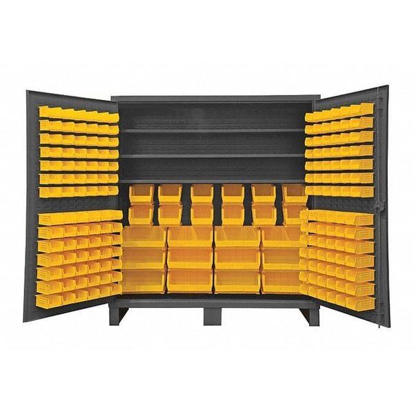 Bin Cabinet, Base Type Legs, Bin Color Yellow, Bin HxWxD (12) 16 in x 15 in x 7 in, (12) 8 in x 15 in x 7 in, (84) 4 in x 5 in x 3 in, (84) 4 in x 7 in x 3 in, Cabinet Color Gray, Cabinet Storage Components Bins, Shelves, Door Type Flush, Frame Assembled Assembled, Mobility Stationary, Number of Bins 192, Number of Cabinet Bins 24, Number of Door Bins 168, Number of Shelves 3, Overall Depth 24 in, Overall Height 78 in, Overall Width 72 in, Bin Depth 5 in, 7 in, 15 in, Bin Height 3 in, 7 in