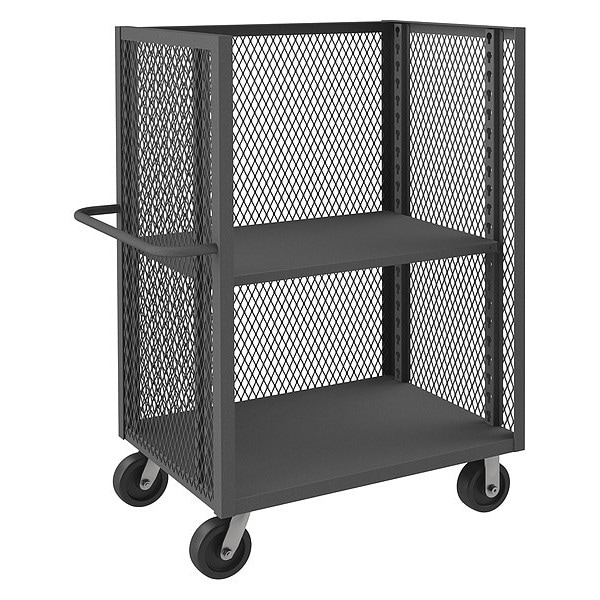 Truck, Load Capacity 3,000 lb, Number of Shelves 2, Shelf Length 45 15/16 in, Shelf Width 26 7/8 in, Shelf Construction Mesh, Caster Brake Type No Brake Included, Caster Wheel Dia. 6 in, Caster Wheel/Tread Material Phenolic, Caster/Wheel Configuration (2) Rigid, (2) Swivel, Caster/Wheel Mounting Location Standard, Finish Powder Coated, Handle Type Flat, Material Iron, Method of Construction Boltless, Overall Length 54 1/2 in, Overall Width 30 1/2 in, Overall Height 56 1/2 in