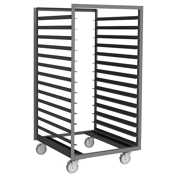 Pan and Tray Truck, Nesting No, Load Capacity 1,200 lb, Overall Height 67 1/8 in, Brake Yes, Overall Width 36 in, Product Type Pan and Tray Truck, Caster Type (4) Swivel, Color Gray, Depth 33 1/2 in, Distance Between Shelves 4 in, Number of Slots 14, Includes Top No, Material Angle Iron, Compatible Pan/Tray Dimensions 29 15/16 x 35 15/16 in, NSF Certified No, Size Full Size