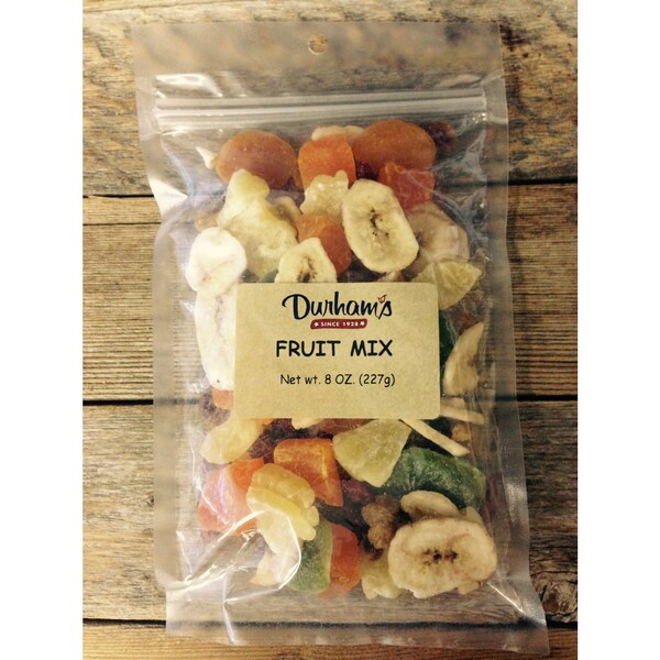 Mixture of dried apricots banana chips pineapple chunks papaya chunks golden raisins dried kiwi and dried cranberries.