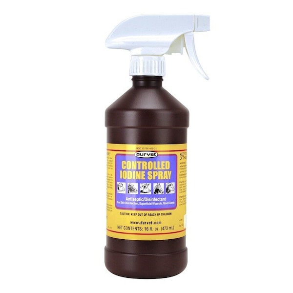 Controlled Iodine Spray is indicated for use in cattle, horses, swine and sheep as a topical antiseptic for use prior to surgical procedures such as castrating and docking; for ringworm and foot rot; for application to the navel of newborn animals; and for minor cuts, teat sores, bruises and abrasions. Compared to Betadine.Products are not always manufacturer specific. Actual product appearance may differ from website image.