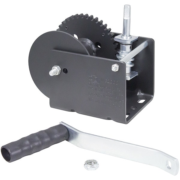 Hand Winch, 1st Layer Load Capacity 2,000 lb, Clutch Type No Clutch, Fully Wound Load Capacity 2,000 lb, Gear Ratio 40:1, Gear Type Worm, Maximum Line Length 49 ft, Number of Gear Settings 1, Operation Lifting, Pulling, Body Material Steel, Body Type Open, Color Black, Compatible Line Steel Cable, Drum Capacity per Line Diameter 59 ft per 1/4 in, 82 ft per 7/32 in, Drum Capacity per Strap Width Not Applicable, Handle Attachment Type Permanent, Handle Mount Location Top, Handle Length 7 in