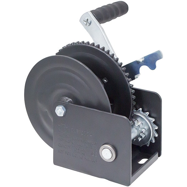 Hand Winch, 1st Layer Load Capacity 1,200 lb, Clutch Type No Clutch, Fully Wound Load Capacity 1,200 lb, Gear Ratio 5.4:1, Gear Type Spur, Maximum Line Length 69 ft, Number of Gear Settings 1, Operation Pulling, Body Material Steel, Body Type Open, Color Black, Compatible Line Steel Cable, Drum Capacity per Line Diameter 205 ft per 1/8 in, 50 ft per 1/4 in, 69 ft per 7/32 in, 93 ft per 3/6 in, Drum Capacity per Strap Width Not Applicable, Handle Attachment Type Permanent