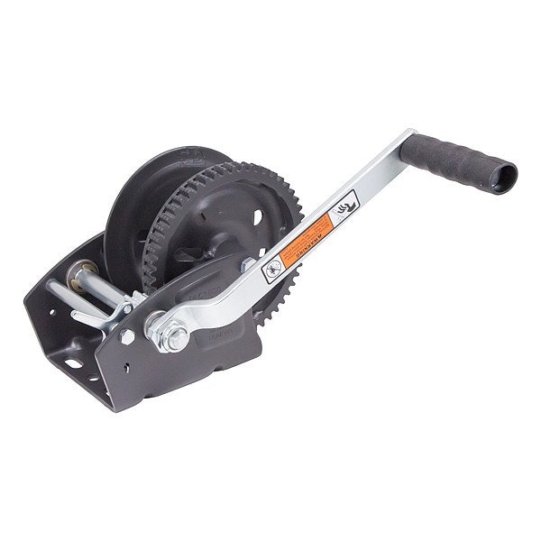 Hand Winch, 1st Layer Load Capacity 2,160 lb, Clutch Type No Clutch, Fully Wound Load Capacity 1,800 lb, Gear Ratio 5.4:1, Gear Type Ratchet, Maximum Line Length 58 ft, Number of Gear Settings 1, Operation Pulling, Body Material Carbon Steel, Body Type Open, Color Silver, Compatible Line Web Strap, Drum Capacity per Line Diameter 47 ft per 5/16 in, 58 ft per 9/32 in, 70 ft per 1/4 in, Drum Capacity per Strap Width 25 ft per 2 in, Handle Attachment Type Permanent, Handle Mount Location Side