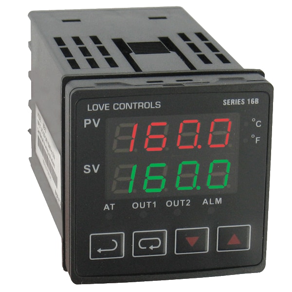 1/16 DIN temperature/process controller, linear voltage output 1 and relay output 2.