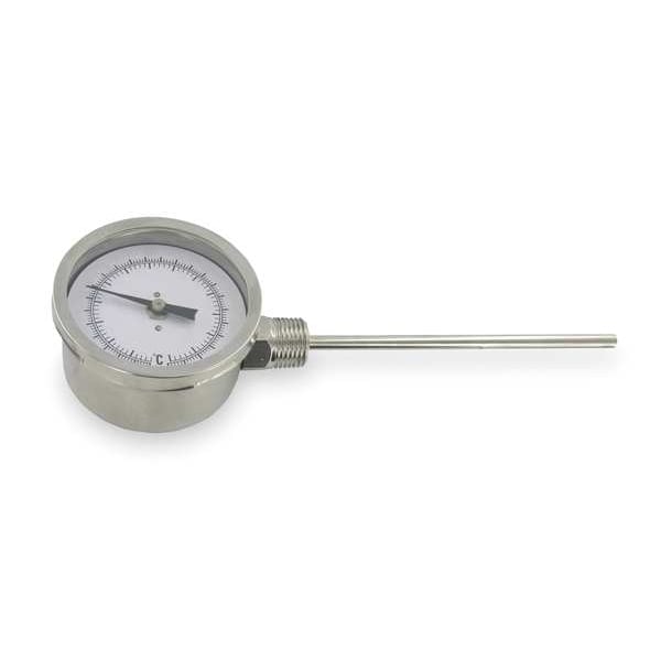 Dial Thermometer, Temperature Range 50 Degrees to 400 Degrees F, Stem Length 4 in, Dial Diameter 3 in, 1/2 in NPT, Right-Side, Includes NIST-Traceable Certificate No, Housing Material Stainless Steel, Lens Material Glass