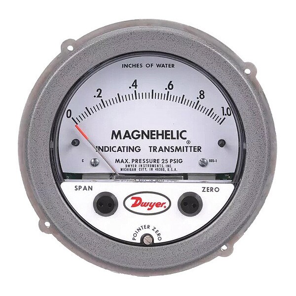 Indicating Transmitter, Output 4 to 20mA, Maximum Pressure 0.25 in wc, Minimum Pressure -0.25 in wc, Accuracy +/-3 Percent of Full Scale, Number of Wires 2, Power Required 10 to 35V DC, Process Connection Size 1/8 in, Process Connection Type NPT, Process Connection Gender Female, IP Rating Not Rated, NEMA Rating Not Rated, Series 605, Electrical Connections Screw Terminals, NIST Traceable Certificate No, Display Type Dial, Connection Location Back, Diameter 5 in
